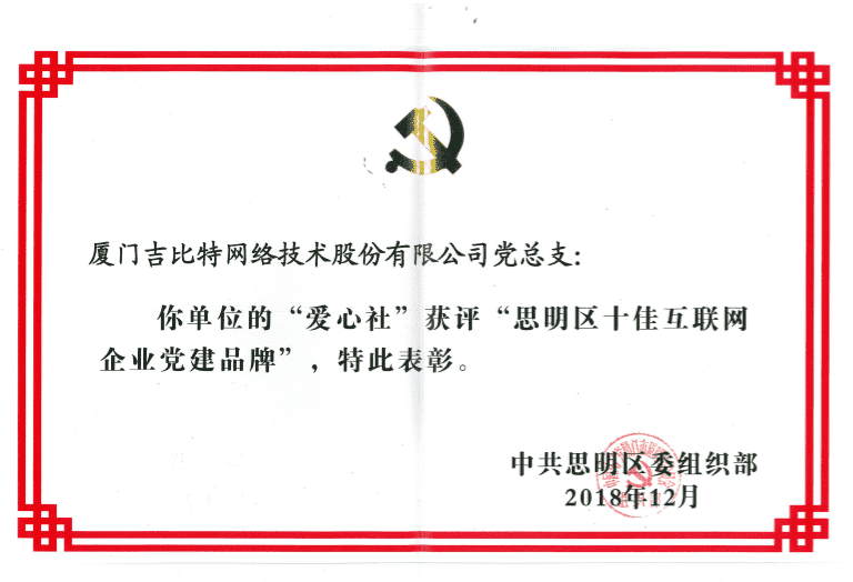 经初审评选、、网络评选和专家评审等环节,,,,"厦门J9.COM网络技术股份有限公司党总支-爱心社" 从全区28个参评党建品牌中脱颖而出,,,获评"思明区十佳互联网企业党建品牌"。。。。